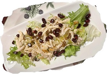 Sfilacciare a mano un petto di cappone, (può andare bene anche di pollo o gallina), fatto bollire precedentemente oppure recuperato dopo la preparazione del brodo. Disporre in un piatto un piccolo fondo di insalata riccia condita con olio e sale, unite il petto condito in una emulsione con aceto, olio evo, sale, pepe, limone e guarnire con qualche gheriglio di noce fatto a pezzetti, i pinoli, aggiungere il cedro candito, l’uvetta sultanina (precedentemente ammollata nel vino) e dei chicchi di melognano maturo. Mescolare bene, lasciando riposare coperto a temperatura ambiente o in fresco per un’ora prima di servire.