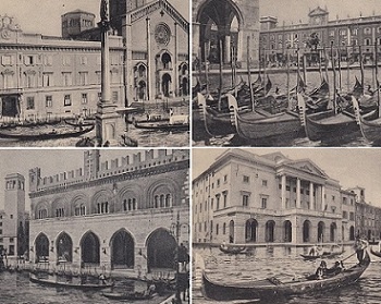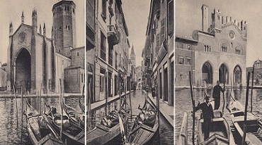 Nota. L’Editore Giusti, attivo a Firenze nel periodo bellico e nel postbellico, è noto per aver prodotto materiale turistico, album fotografici e cartoline illustrate caratterizzate da una sperimentazione grafica. Fra gli anni 1940 e 1955 alcune sue serie presentavano montaggi fotografici, progetti urbanistici immaginari, reinterpretazioni di scorci cittadini, soluzioni ibride tra fotografia e illustrazione aerografata. In questo contesto la serie dedicata a Piacenza si inserisce perfettamente all’interno di una tendenza editoriale che univa fantasia, ricostruzione postbellica e promozione turistica. Il tema principale è la trasposizione immaginaria della città di Piacenza in un contesto marittimo con le immagini che ritraggono; gondole veneziane che navigano tra le vie cittadine, specchi d’acqua che si insinuano fra i palazzi, canali che sostituiscono tratti urbani, riflessi marini davanti a edifici simboli della città. Questa rappresentazione mescola elementi di Venezia con la topografia piacentina e crea una “Venezia padana alternativa”, un esperimento di urbanistica immaginaria tipico dell’epoca. Inoltre l’attenzione ai dettagli cittadini suggerisce che autore o committente fossero conoscenti diretti della città. Potrebbe trattarsi di un lavoro privato o semi-privato, destinato a un uso interno e poi mai reso pubblico.